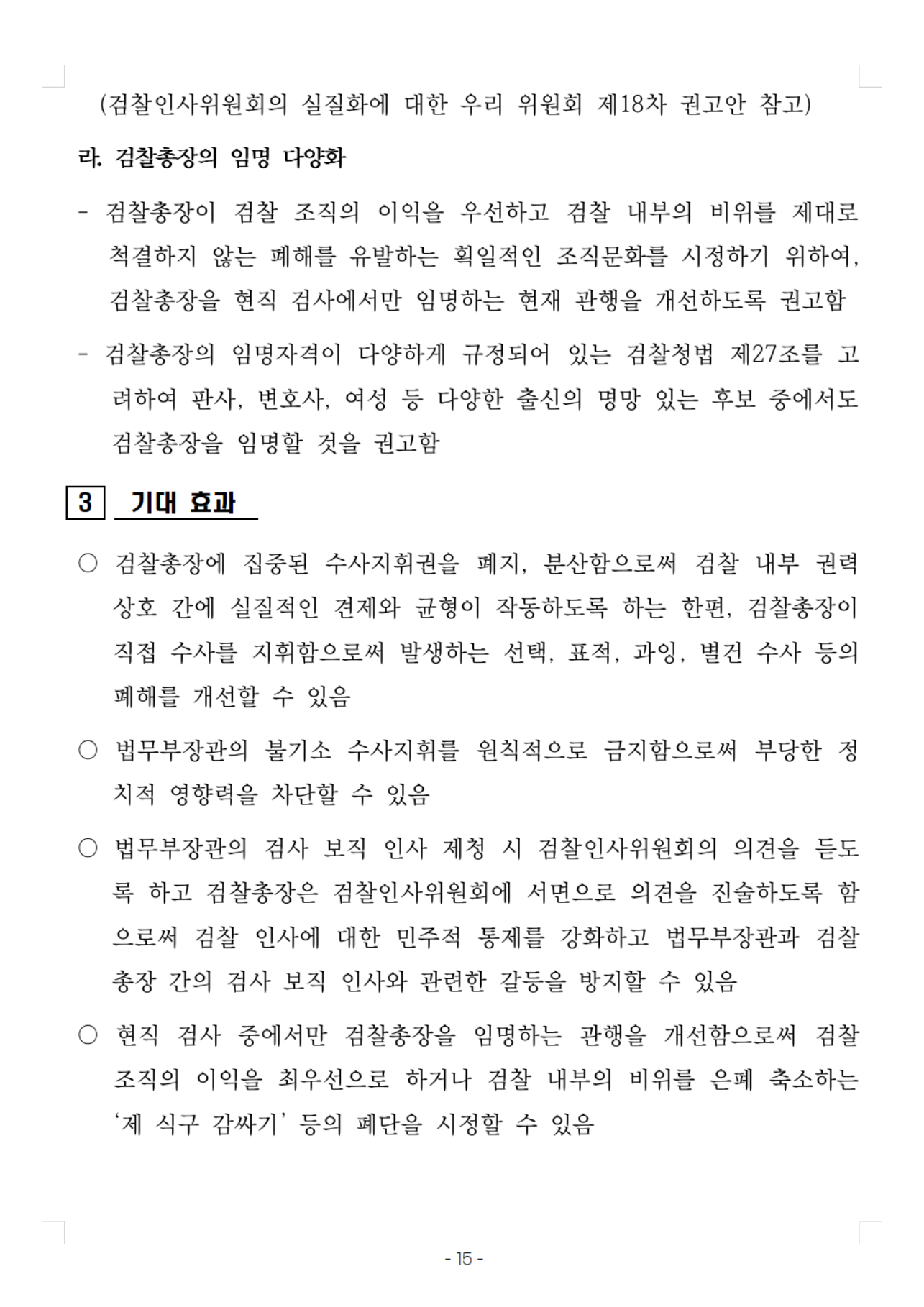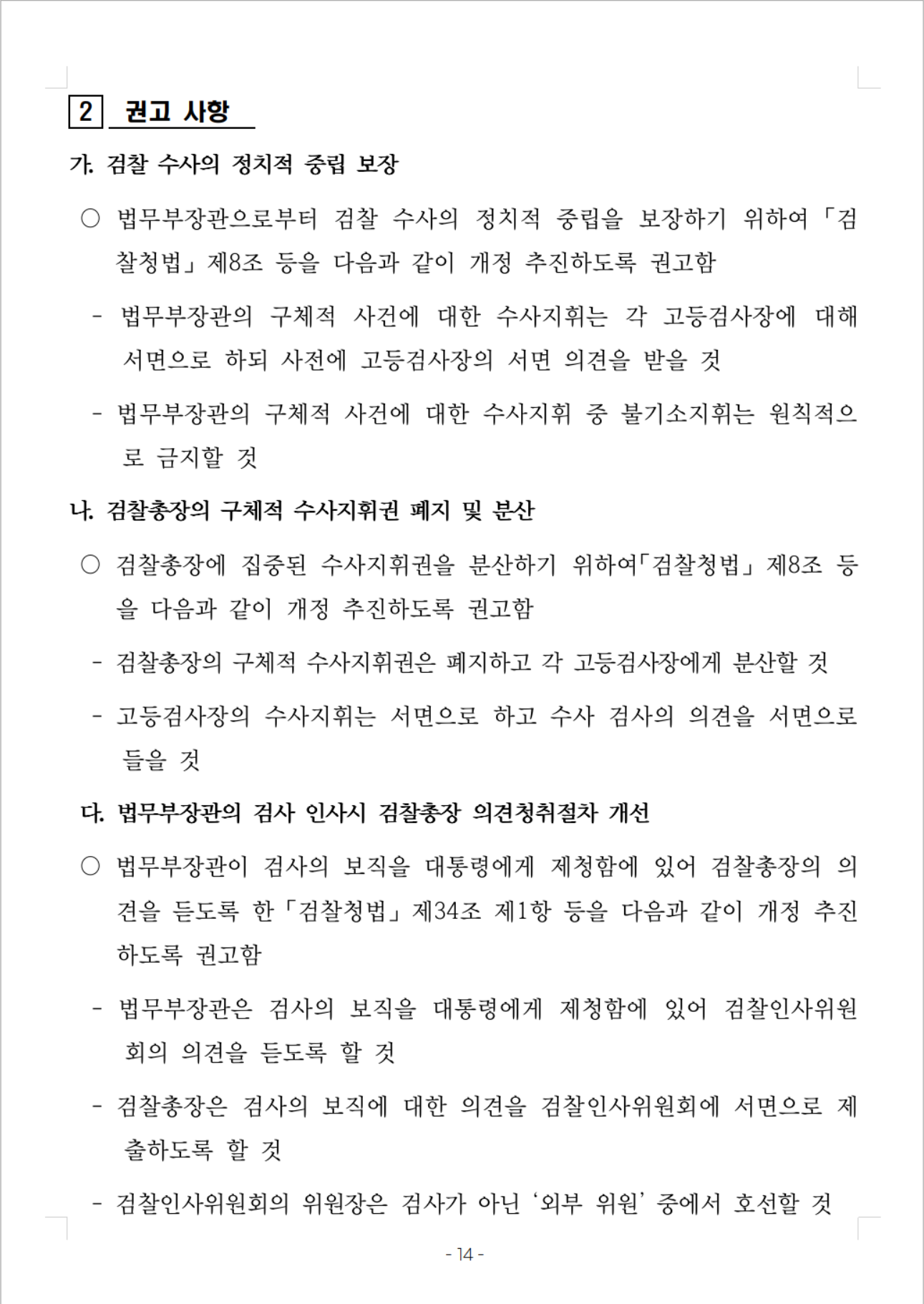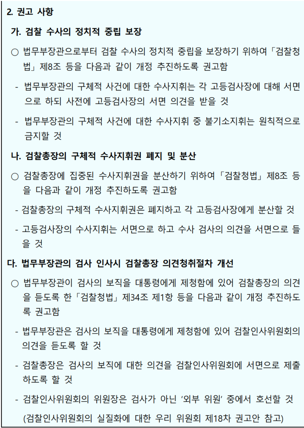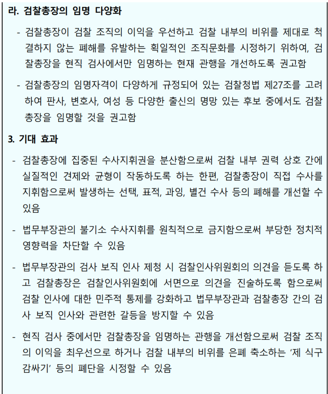 - 검찰총장이 검찰 조직의 이익을 우선하고 검찰 내부의 비위를 제대로 척결하지 않는 폐해를 유발하는 획일적인 조직문화를 시정하기 위하여, 검찰총장을 현직 검사에서만 임명하는 현재 관행을 개선하도록 권고함