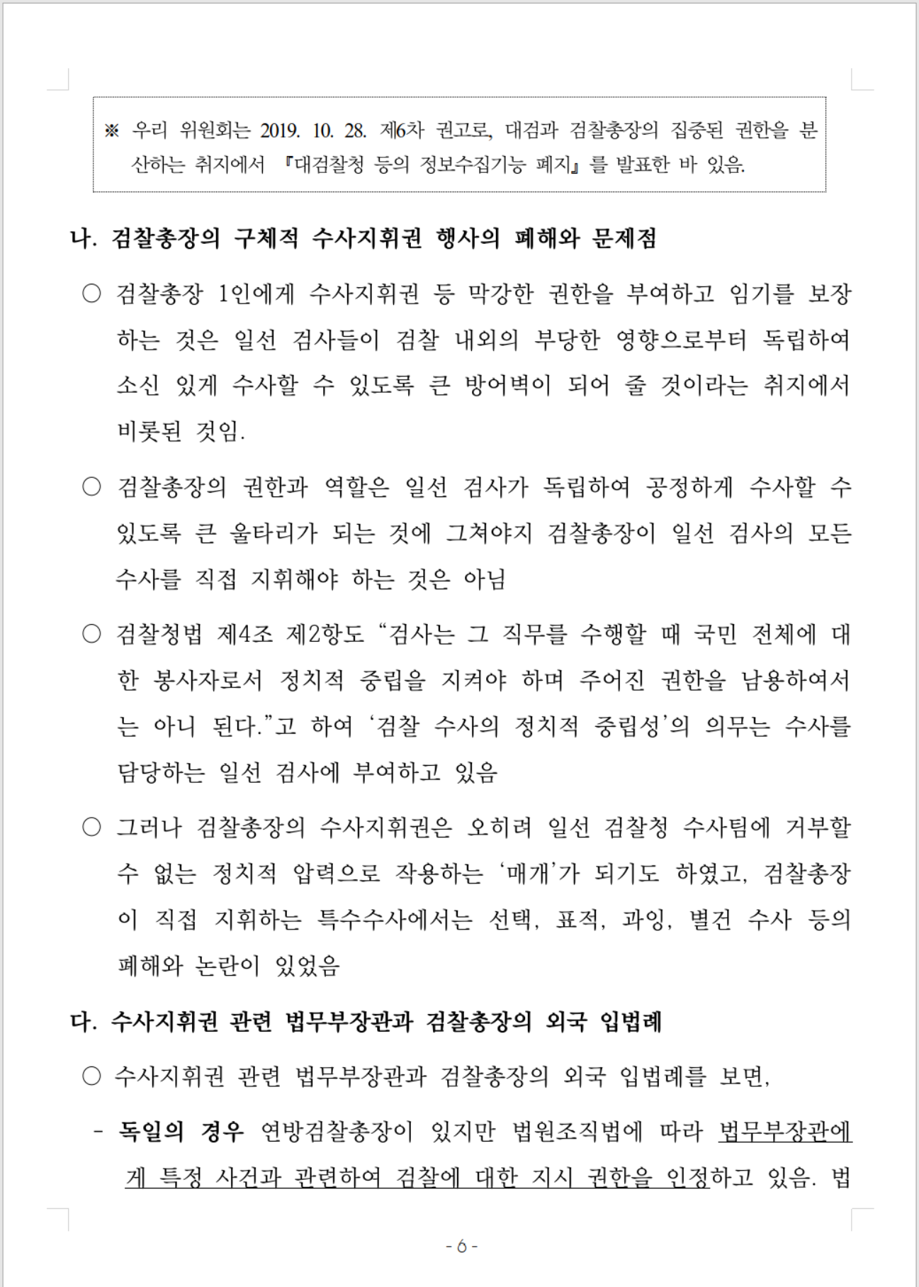 ※ 우리 위원회는 2019. 10. 28. 제6차 권고로, 대검과 검찰총장의 집중된 권한을 분산하는 취지에서 『대검찰청 등의 정보수집기능 폐지』를 발표한 바 있음. |