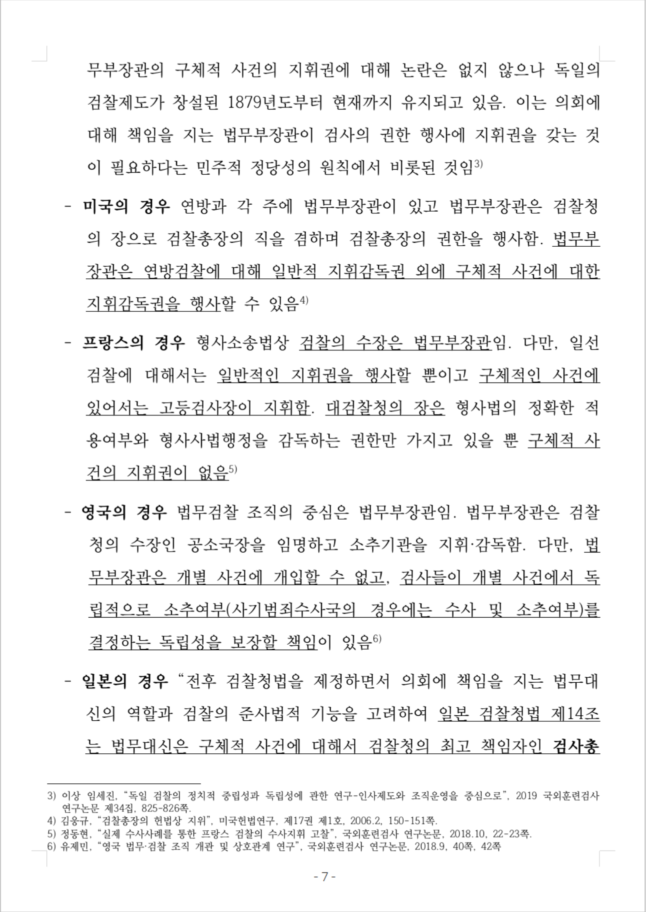 - 일본의 경우 “전후 검찰청법을 제정하면서 의회에 책임을 지는 법무대신의 역할과 검찰의 준사법적 기능을 고려하여 일본 검찰청법 제14조는 법무대신은 구체적 사건에 대해서 검찰청의 최고 책임자인 검사총장만을 직접 지휘할 수 있도록 하고 검사총장은 자기의 권한 및 책임 하에 그 지휘의 타당성 여부를 판단한 후 검사로 하여금 사건처리를 하도록” 규정함