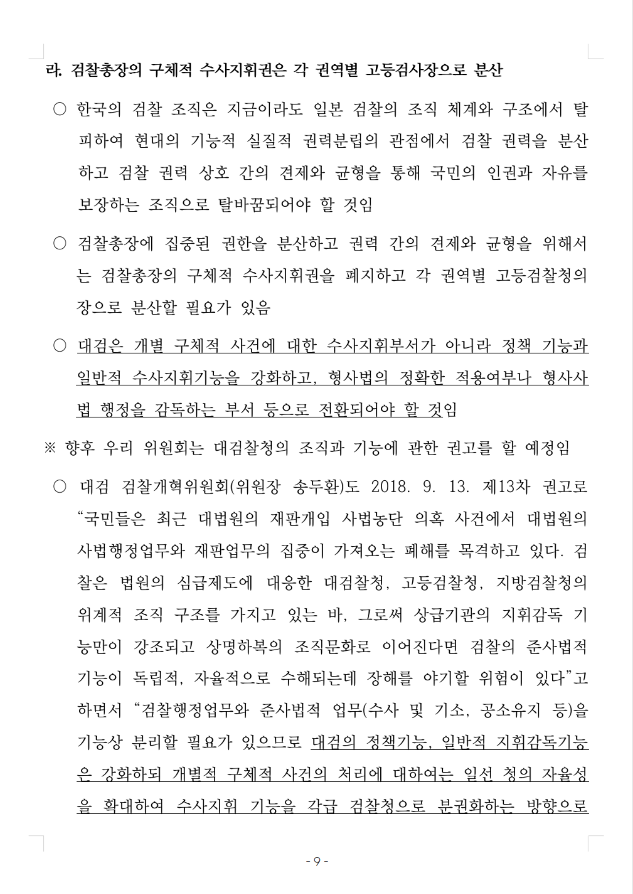 ○ 대검 검찰개혁위원회(위원장 송두환)도 2018. 9. 13. 제13차 권고로 “국민들은 최근 대법원의 재판개입 사법농단 의혹 사건에서 대법원의 사법행정업무와 재판업무의 집중이 가져오는 폐해를 목격하고 있다. 검찰은 법원의 심급제도에 대응한 대검찰청, 고등검찰청, 지방검찰청의 위계적 조직 구조를 가지고 있는 바, 그로써 상급기관의 지휘감독 기능만이 강조되고 상명하복의 조직문화로 이어진다면 검찰의 준사법적 기능이 독립적, 자율적으로 수해되는데 장해를 야기할 위험이 있다”고 하면서 “검찰행정업무와 준사법적 업무(수사 및 기소, 공소유지 등)을 기능상 분리할 필요가 있으므로 대검의 정책기능, 일반적 지휘감독기능은 강화하되 개별적 구체적 사건의 처리에 대하여는 일선 청의 자율성을 확대하여 수사지휘 기능을 각급 검찰청으로 분권화하는 방향으로 조직개선안을 마련할 것”을 권고한 바 있음
