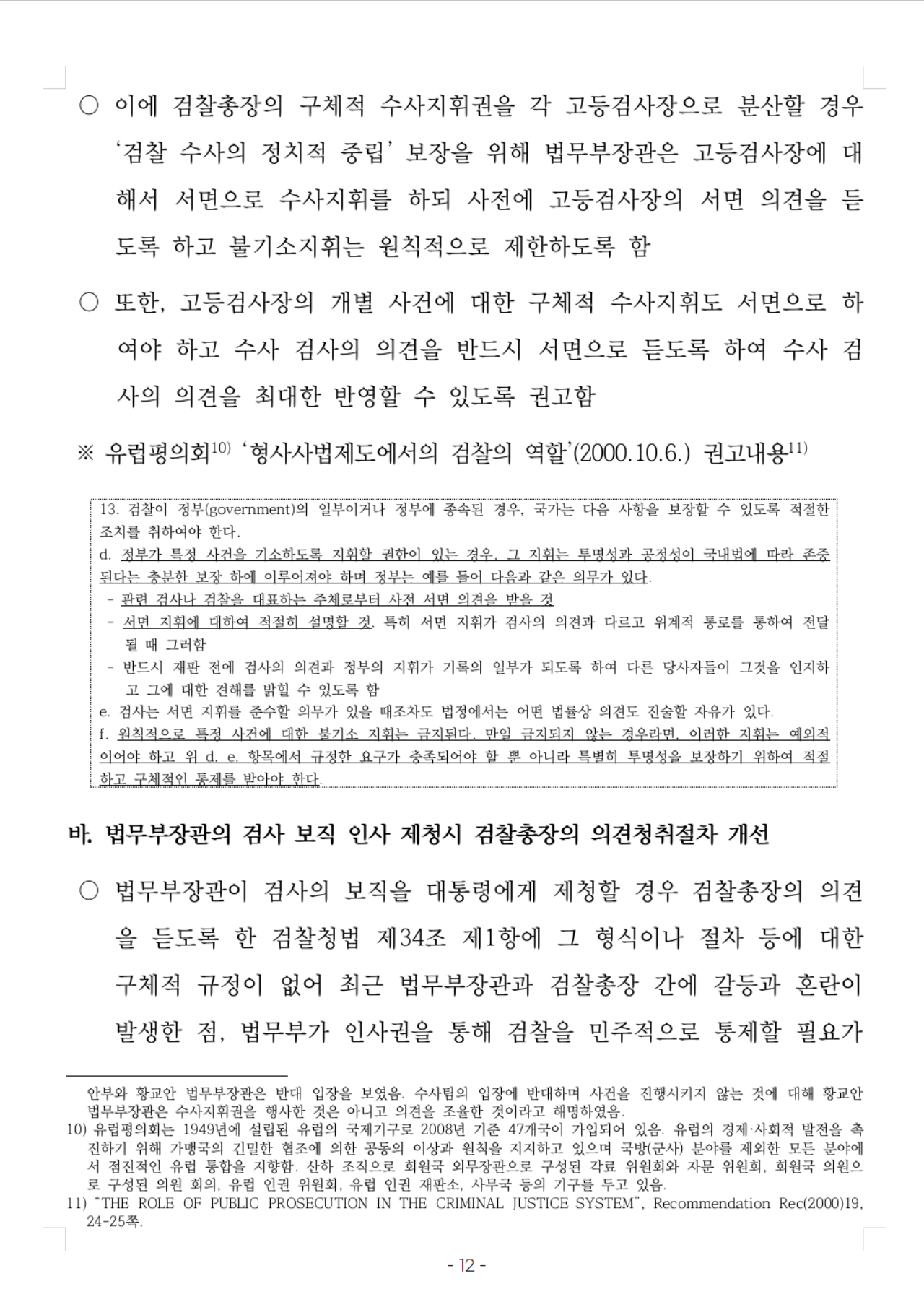 13. 검찰이 정부(government)의 일부이거나 정부에 종속된 경우, 국가는 다음 사항을 보장할 수 있도록 적절한 조치를 취하여야 한다. d. 정부가 특정 사건을 기소하도록 지휘할 권한이 있는 경우, 그 지휘는 투명성과 공정성이 국내법에 따라 존중된다는 충분한 보장 하에 이루어져야 하며 정부는 예를 들어 다음과 같은 의무가 있다. - 관련 검사나 검찰을 대표하는 주체로부터 사전 서면 의견을 받을 것 - 서면 지휘에 대하여 적절히 설명할 것. 특히 서면 지휘가 검사의 의견과 다르고 위계적 통로를 통하여 전달될 때 그러함 - 반드시 재판 전에 검사의 의견과 정부의 지휘가 기록의 일부가 되도록 하여 다른 당사자들이 그것을 인지하고 그에 대한 견해를 밝힐 수 있도록 함 e. 검사는 서면 지휘를 준수할 의무가 있을 때조차도 법정에서는 어떤 법률상 의견도 진술할 자유가 있다. f. 원칙적으로 특정 사건에 대한 불기소 지휘는 금지된다. 만일 금지되지 않는 경우라면, 이러한 지휘는 예외적이어야 하고 위 d. e. 항목에서 규정한 요구가 충족되어야 할 뿐 아니라 특별히 투명성을 보장하기 위하여 적절하고 구체적인 통제를 받아야 한다. |