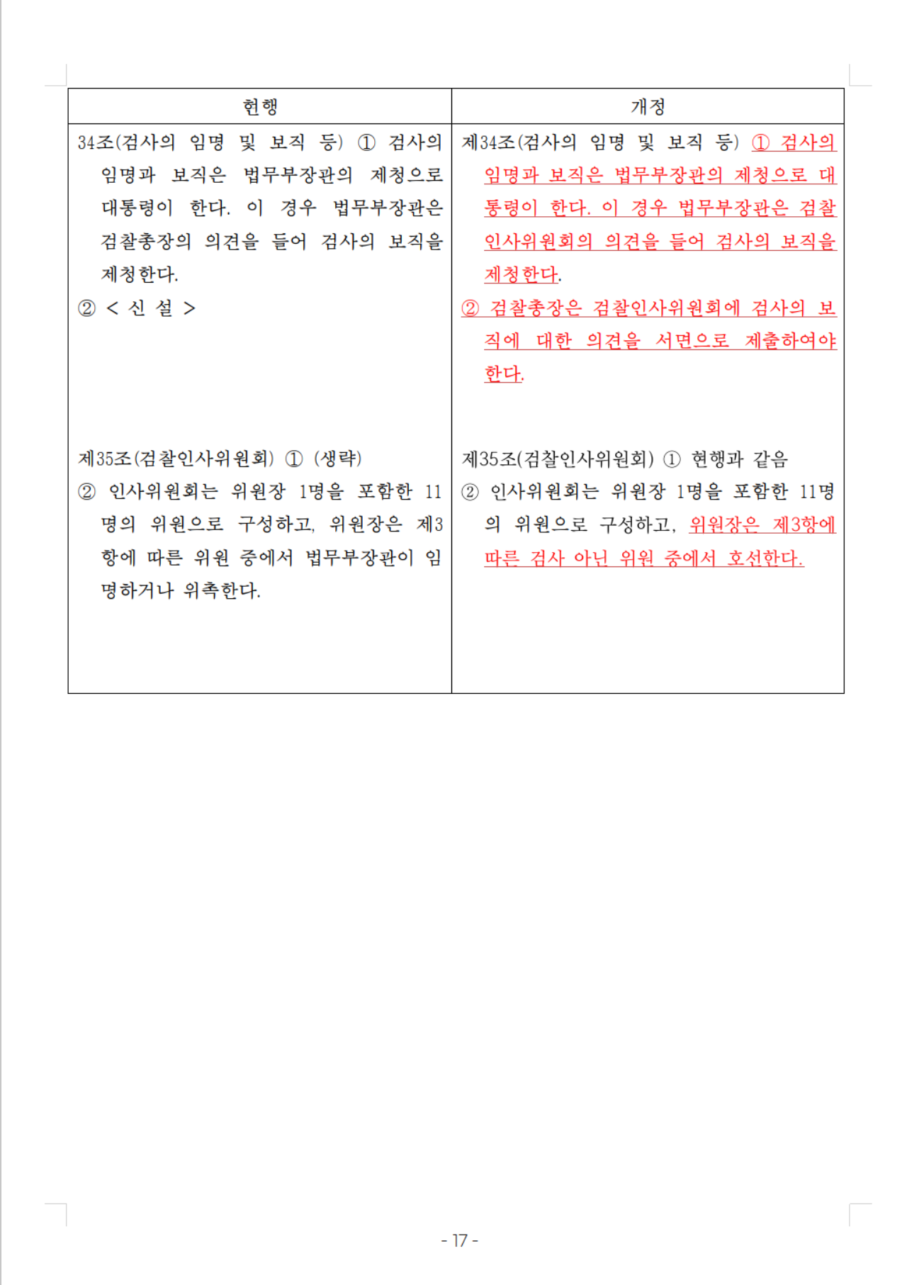 제35조(검찰인사위원회) ① 현행과 같음 ② 인사위원회는 위원장 1명을 포함한 11명의 위원으로 구성하고, 위원장은 제3항에 따른 검사 아닌 위원 중에서 호선한다. |