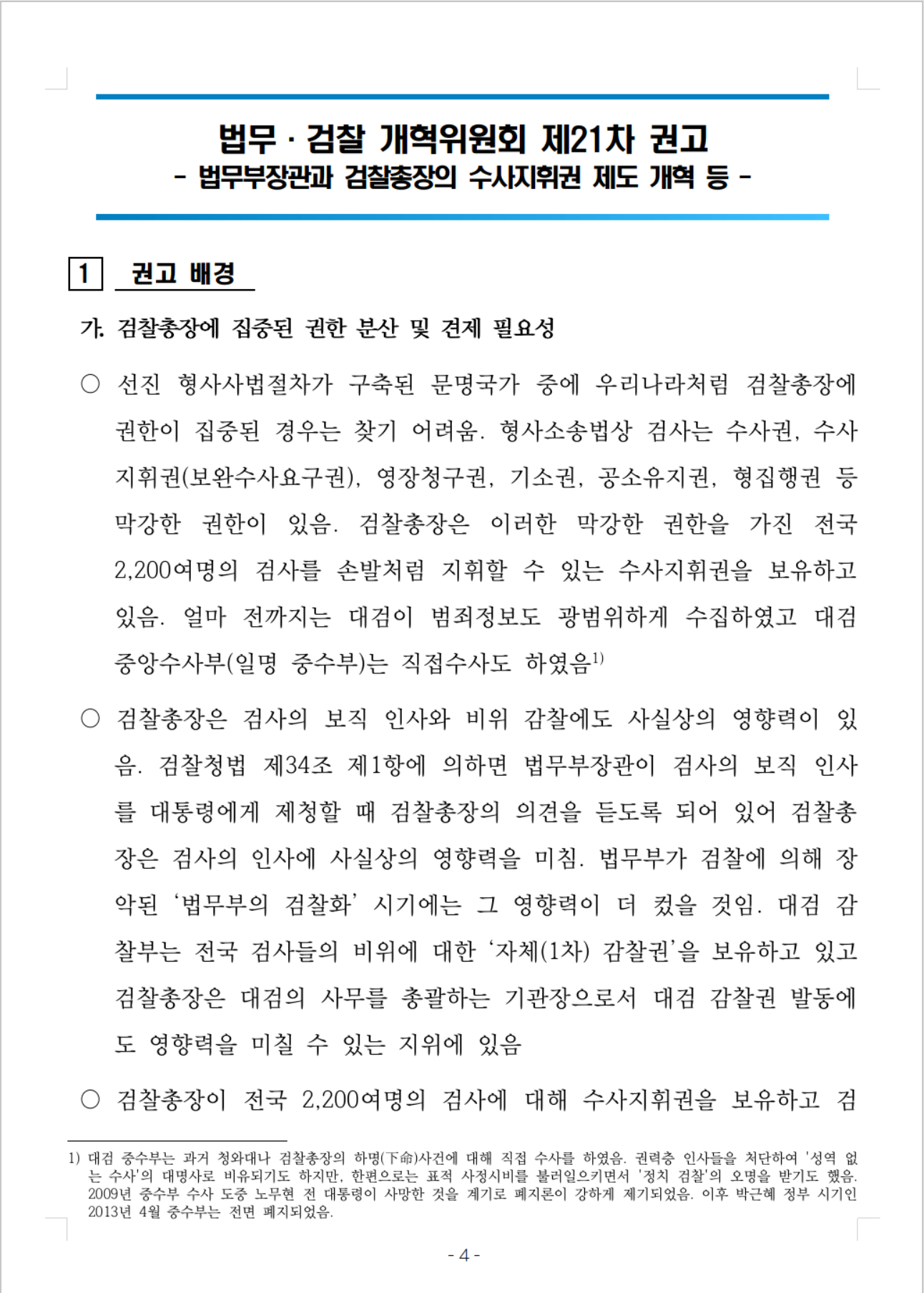 가. 검찰총장에 집중된 권한 분산 및 견제 필요성