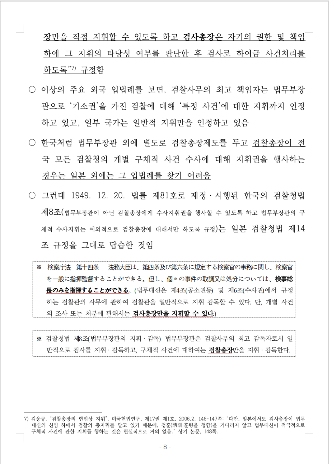 ○ 그런데 1949. 12. 20. 법률 제81호로 제정ㆍ시행된 한국의 검찰청법 제8조(법무부장관이 아닌 검찰총장에게 수사지휘권을 행사할 수 있도록 하고 법무부장관의 구체적 수사지휘는 예외적으로 검찰총장에 대해서만 하도록 규정)는 일본 검찰청법 제14조 규정을 그대로 답습한 것임