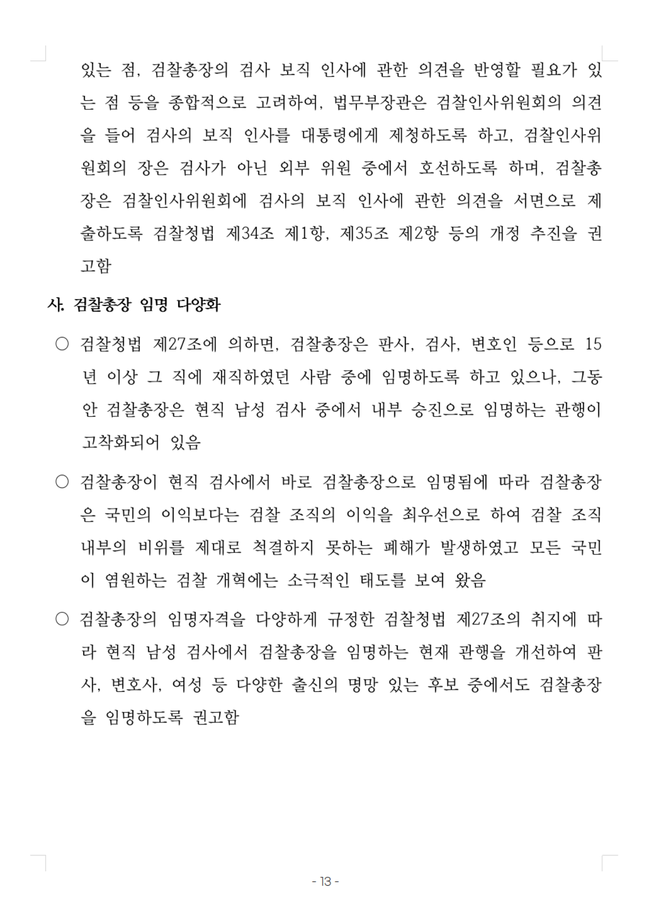 ○ 검찰총장의 임명자격을 다양하게 규정한 검찰청법 제27조의 취지에 따라 현직 남성 검사에서 검찰총장을 임명하는 현재 관행을 개선하여 판사, 변호사, 여성 등 다양한 출신의 명망 있는 후보 중에서도 검찰총장을 임명하도록 권고함