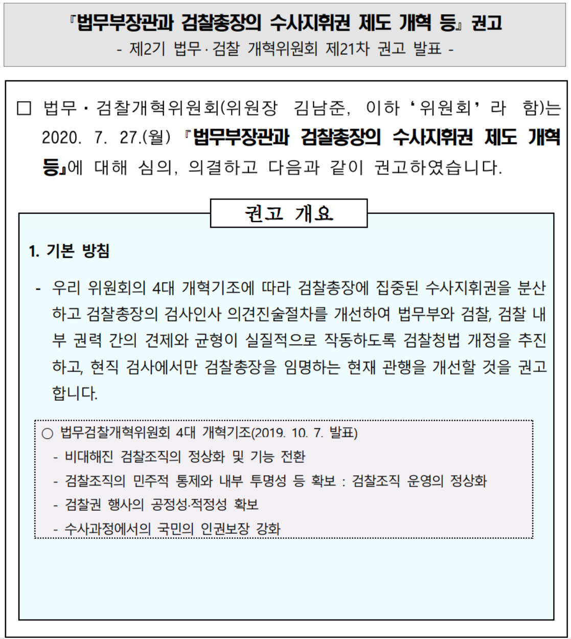 법무·검찰 개혁위원회 제21차 권고 - 법무부장관과 검찰총장의 수사지휘권 제도 개혁 등 - |