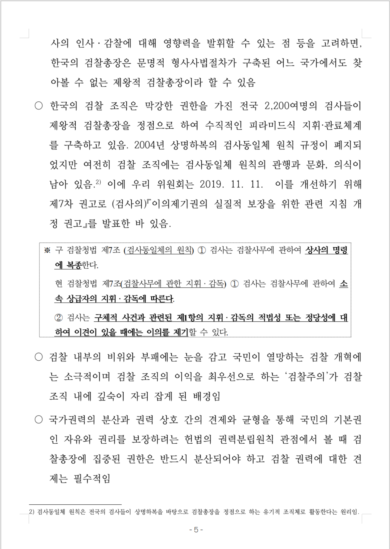 ○ 한국의 검찰 조직은 막강한 권한을 가진 전국 2,200여명의 검사들이 제왕적 검찰총장을 정점으로 하여 수직적인 피라미드식 지휘·관료체계를 구축하고 있음. 2004년 상명하복의 검사동일체 원칙 규정이 폐지되었지만 여전히 검찰 조직에는 검사동일체 원칙의 관행과 문화, 의식이 남아 있음. 이에 우리 위원회는 2019. 11. 11. 이를 개선하기 위해 제7차 권고로 (검사의)『이의제기권의 실질적 보장을 위한 관련 지침 개정 권고』를 발표한 바 있음.