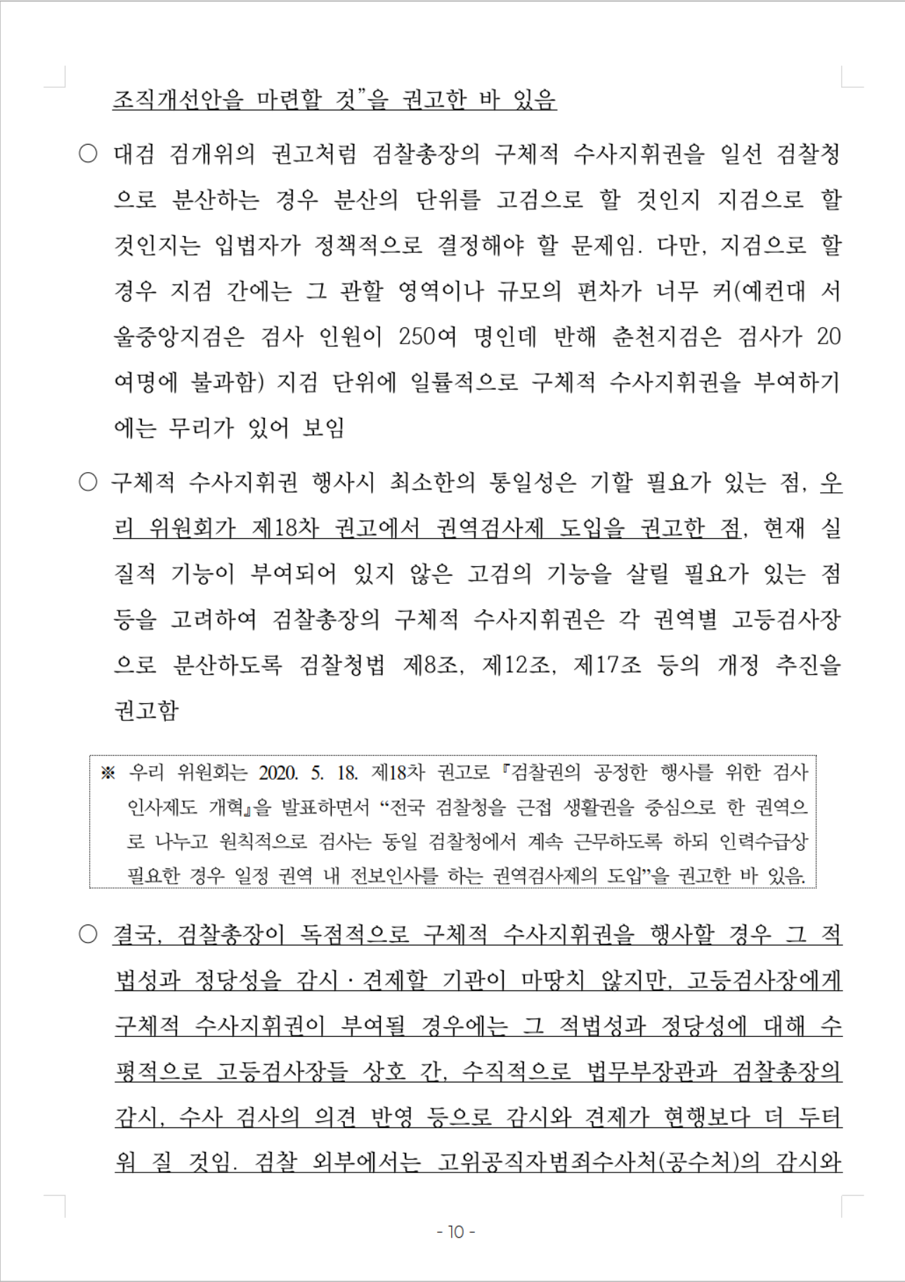 ○ 구체적 수사지휘권 행사시 최소한의 통일성은 기할 필요가 있는 점, 우리 위원회가 제18차 권고에서 권역검사제 도입을 권고한 점, 현재 실질적 기능이 부여되어 있지 않은 고검의 기능을 살릴 필요가 있는 점 등을 고려하여 검찰총장의 구체적 수사지휘권은 각 권역별 고등검사장으로 분산하도록 검찰청법 제8조, 제12조, 제17조 등의 개정 추진을 권고함