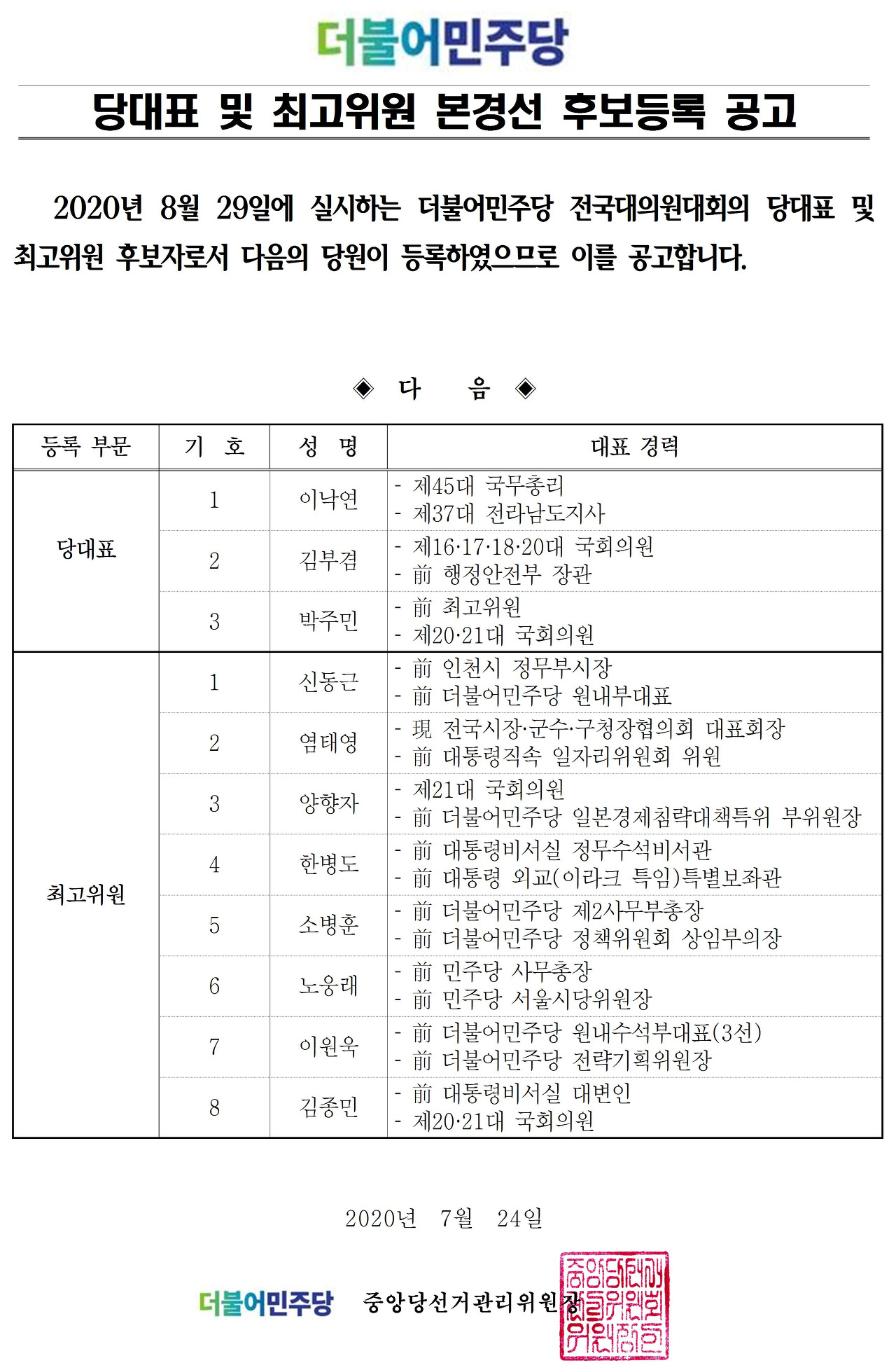 □ 권리당원 ○ 온라인투표 : 24일(월) 오전 9시~ 25일(화) 오후 10시 ○ 강제ARS투표 : 26일(수) 오전 9시 ~ 오후 9시 ○ 자발ARS투표 : 27일(목) 오전 9시 ~ 오후 9시 ※ 권리당원 자격기준 - 2019년 12월 31일까지 입당완료 된 자 - 2019년 7월 1일부터 2020년 6월 30일(최근 1년간)까지 당비 6회 이상 납부한 자 - 체납당비 처리금지 기간 : 2020년 3월 1일부터 □ 전국대의원 ○ 온라인투표 : 26일(수) 오전 9시 ~ 27일(목) 오후 10시 ○ 강제ARS투표 : 28일(금) 오전 9시 ~ 오후 9시 ○ 자발ARS투표 : 29일(토) 오전 9시 ~ 오후 3시 □ 재외국민대의원 ○ 이메일투표 : 24일(월) 오전 10시 ~ 26일(수) 오후 6시(한..