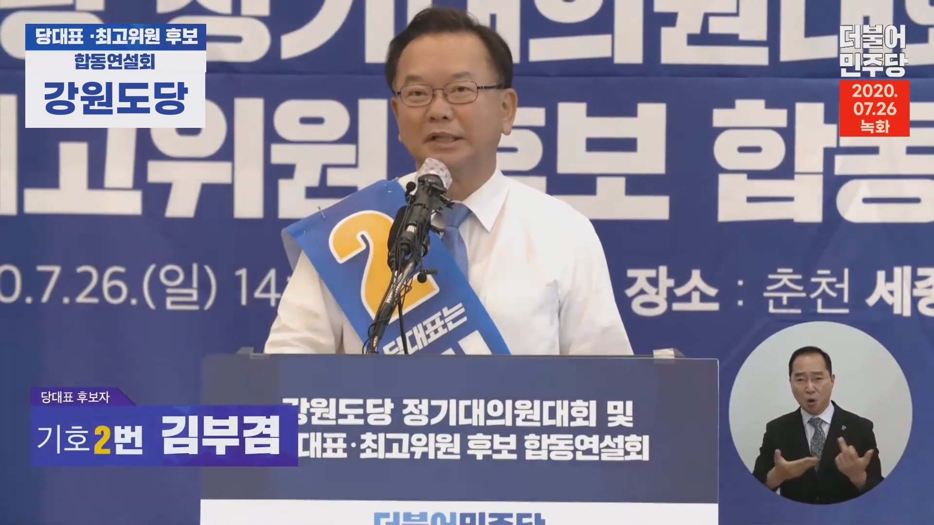 [더불어민주당] 2020 정기대의원대회 -강원도당- 2020.07.26. 재집권의 선봉장 책임지는 김부겸 기호 2번 김부겸 당대표 후보 youtu.be/xTecw5b_DOs 존경하는 강원도민 여러분 그리고 전국에서 오신 대의원 동지 여러분 그리고 인터넷을 통해서 이 장면을 보고 계시는 국민여러분 당원동지 여러분 반갑습니다. 당대표 후보기호 2번 김부겸, 다시 인사 올립니다. 도와주십시오. 강원도에서 또 여러 가지 수해가 발생했습니다. 그 분들의 아픈 마음에 위로를 드리고 싶습니다. 그리고 빨리 복구 되시기를 희망합니다. 그리고 또 지난 주에 주욱 강원도의 몇 곳을 방문하면서 저는 평창올림픽 이후 어떤 새로운 도약을 기대하고 있었는데 여러 단체장님들이 정말 걱정이 많으시드라구요. 그 중에서도 오늘 이 자리..